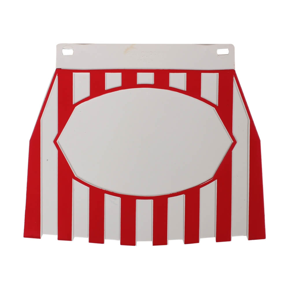Eye-catching mudflap with red and white vertical stripes. Has an oval section where you can put your country sticker, astrological sign, etc.